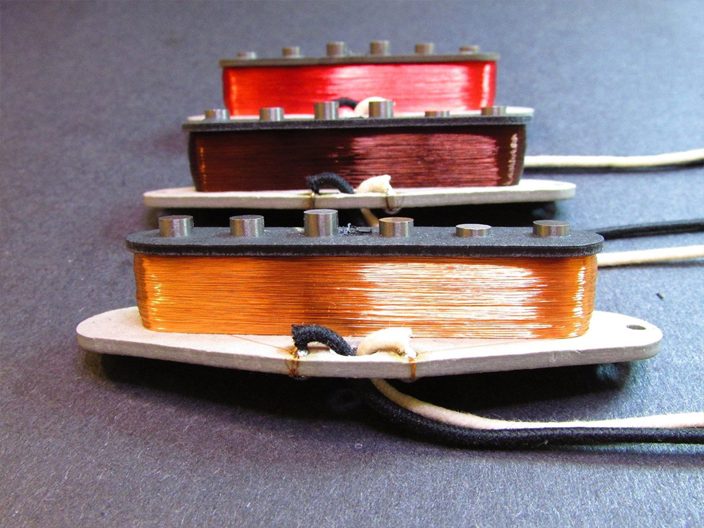 A unique set of pickups for sure. It's comprised of a vintage '54 Strat alnico five heavy Formvar neck pickup with a vintage 50's stagger wound to a conservative 5.85k. The middle is a 60's style alnico five wound with 42 awg plain enamel to a sweet sounding 5.95k. And the standout of the set, the bridge is a high output alnico 2 pickup with SPN piled high to the mid 12k range. These produce a variety of tones and when combined in the 2 and 4 positions they create some real unique sounds. If you're looking at this set you probably already know the sound of "the" black Strat, we call it the "Pink Tone" set for a not too subtle reference to the band Pink Floyd. This set is for those who desire that ever so cool sound of one of the greats.